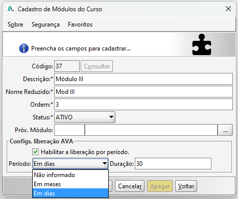 Os Módulos são criados para posteriormente serem vinculados nas disciplinas. Por isso, os Módulos possuem uma validação de Período em que a disciplina estará disponível para ser cursada pelos alunos.