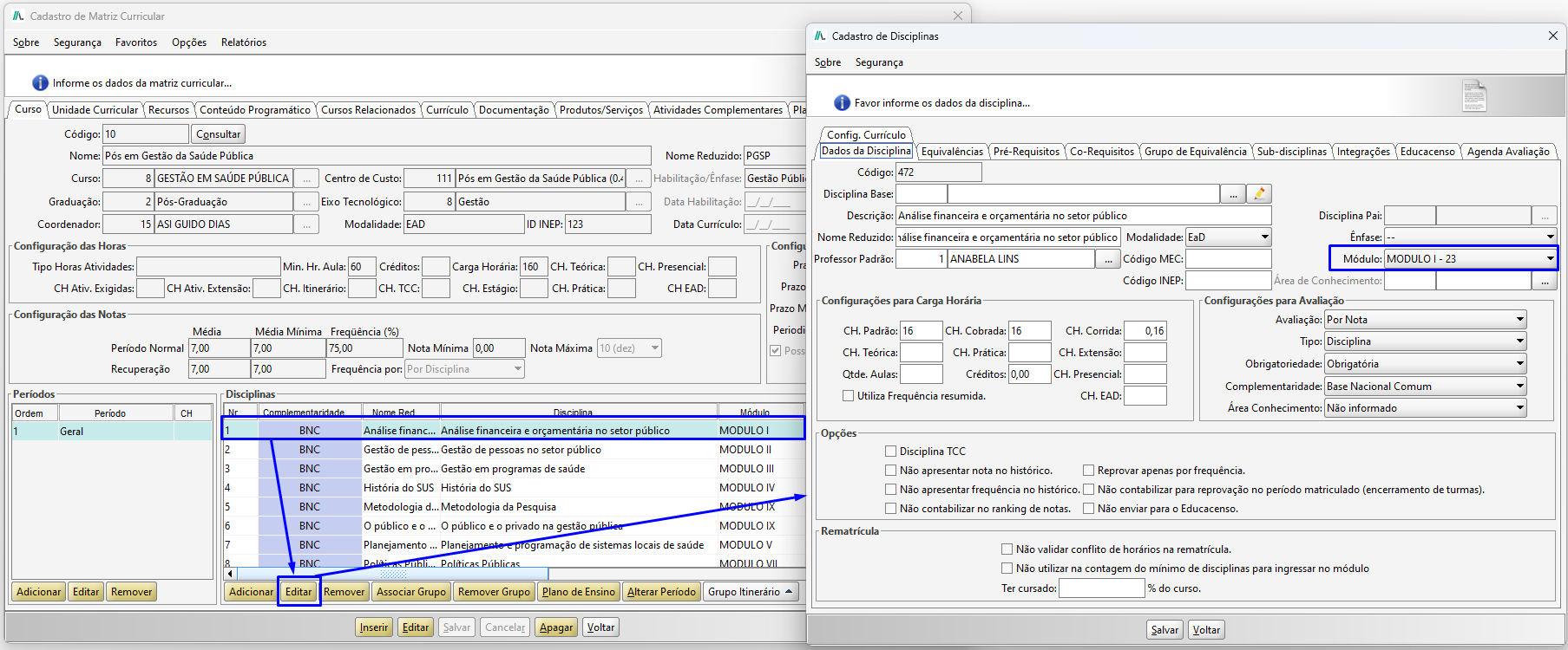 Para vincular os Módulos nas disciplinas, você deve acessar o menu Acadêmico, clicar em Estrutura Curricular e em Matriz Curricular, busque pelo Curso que irá realizar o vínculo, selecione o período, selecione uma disciplina, clique no botão Editar, e informe o campo Módulo. É preciso vincular o módulo na disciplina para que ela possa ser ofertada em determinado período na tela do Calendário de Aulas.