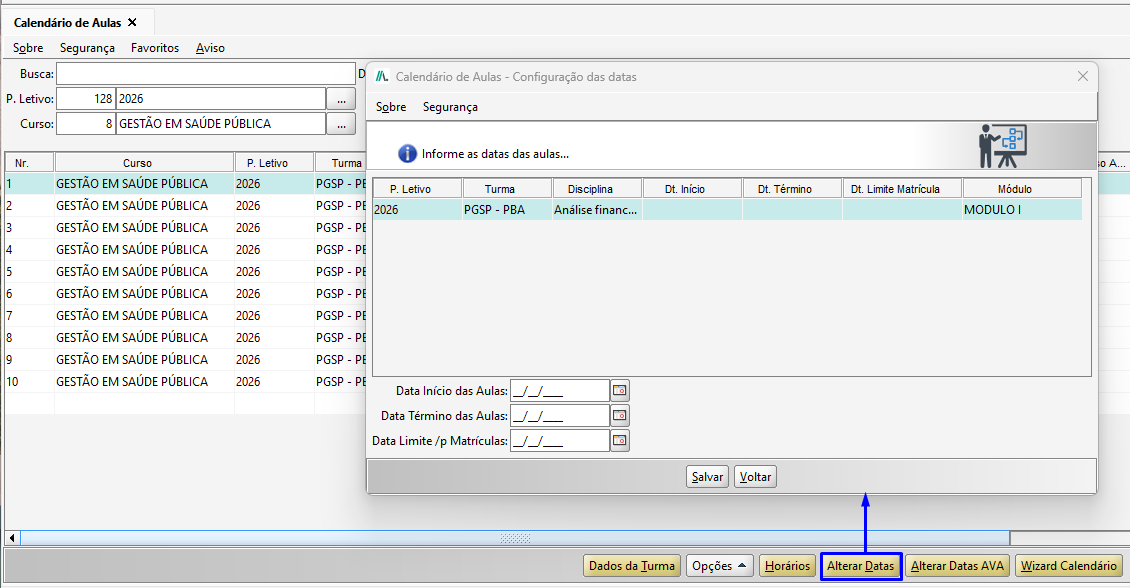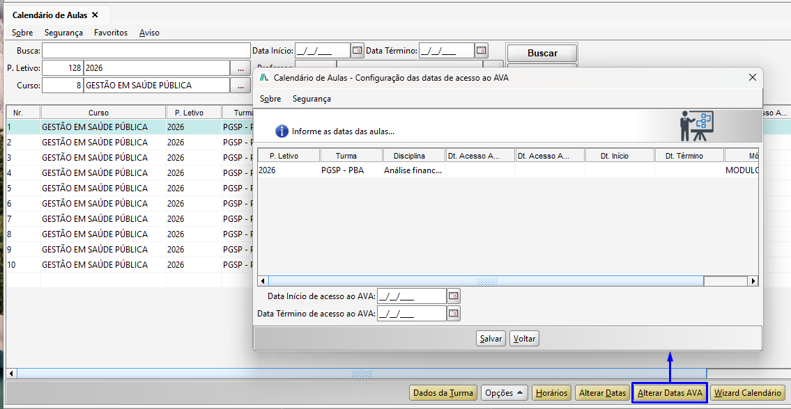 Alterar Datas AVA: Permite configurar a Data de Inicio e Término em que o aluno terá acesso a disciplina no seu ambiente AVA.