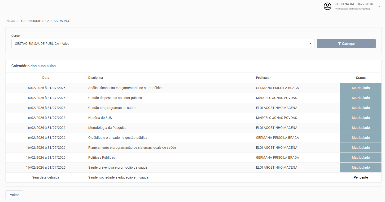 Assim, serão apresentadas as disciplinas que o aluno está matriculado ou pendentes, com suas respectivas datas a serem ofertadas.