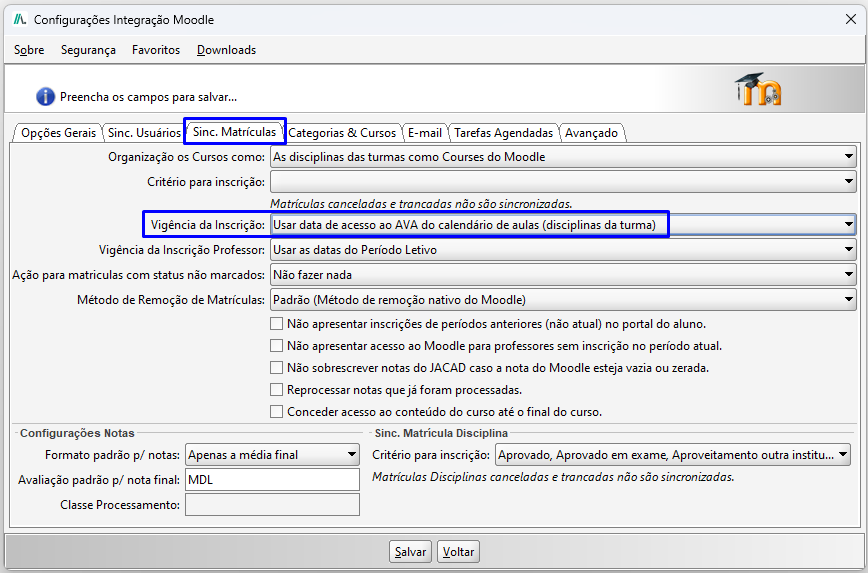 Acesse o menu Integrações, vá até AVA, clique em Moodle e em Configurações. Na tela de Configurações Integração Moodle, clique na aba Sinc. Matrículas, e no campo Vigência da Inscrição, utilize a opção Usar data do calendário de aulas (disciplinas da turma).