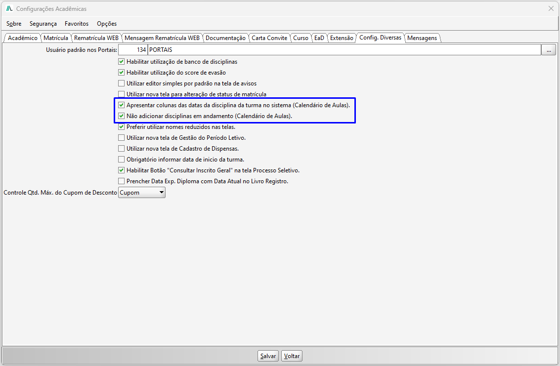 Acesse o menu Preferências, navegue até Configurações, clique em Acadêmicas e em Acadêmico. Na tela de Configurações Acadêmicas clique na aba Config. Diversas.