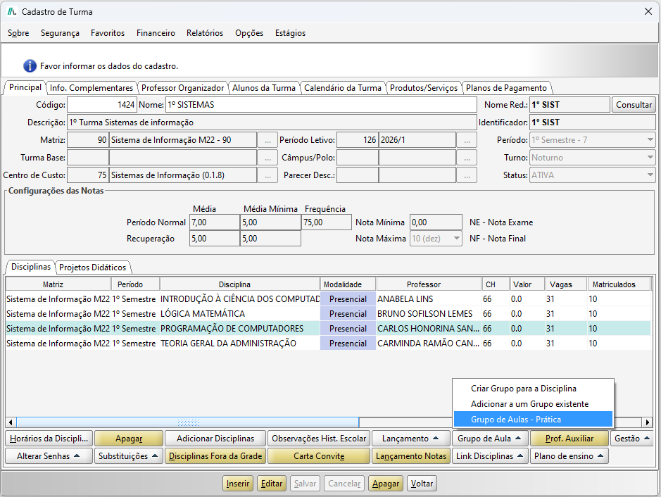 - Após vinculado o sistema de avaliação na disciplina da Turma e criado o Grupo de Aula Prática, não é mais possível alterar o sistema de avaliação.