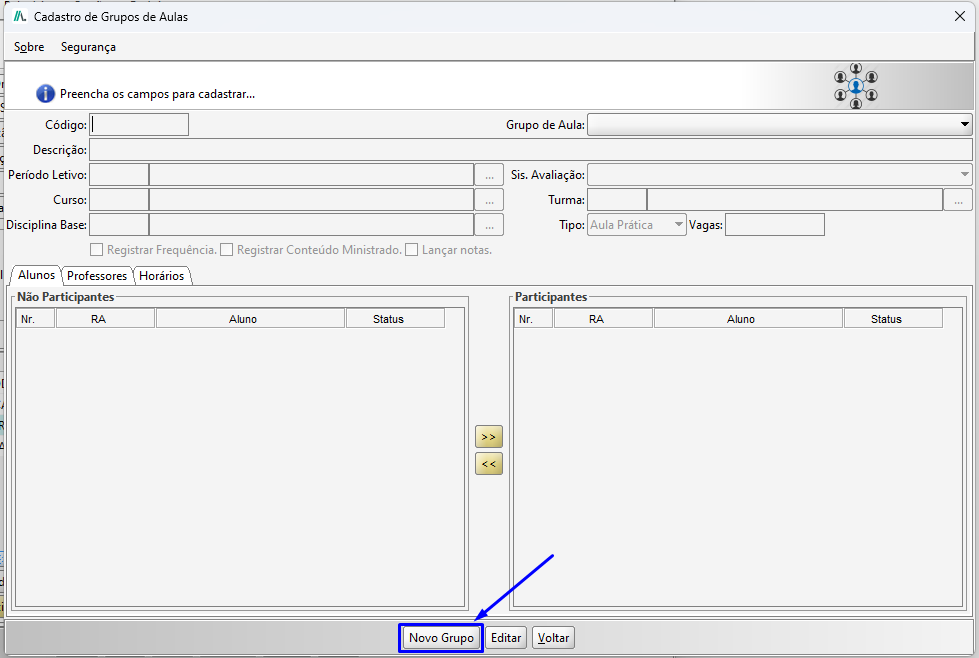 Na tela de Cadastro de Grupos de Aulas, clique no botão Novo Grupo.