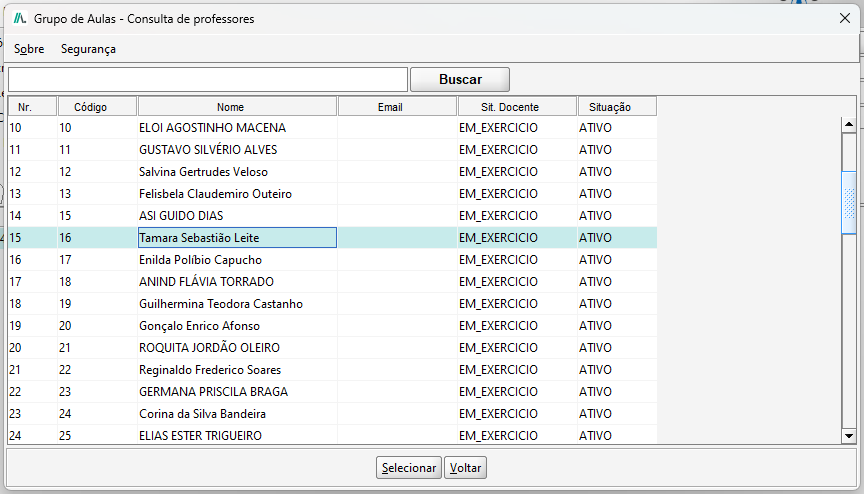 Na tela de Grupo de Aulas - Consulta de Professores, selecione o professor desejado e clique no botão Selecionar.
