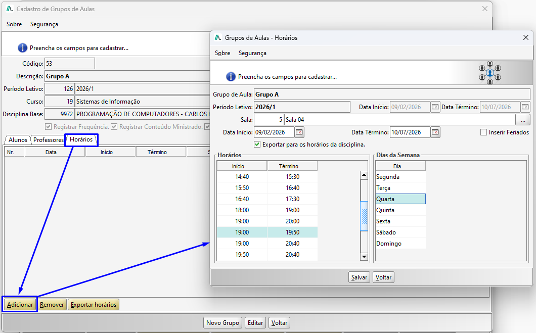 Na tela de Cadastro de Grupos de Aulas, clique na aba Horários e em Adicionar. Na tela que será aberta de Grupo de Aulas - Horários, informe a sala, verifique a data de inicio e término, selecione o horário e o dia da semana, para finalizar clique no botão Salvar.
