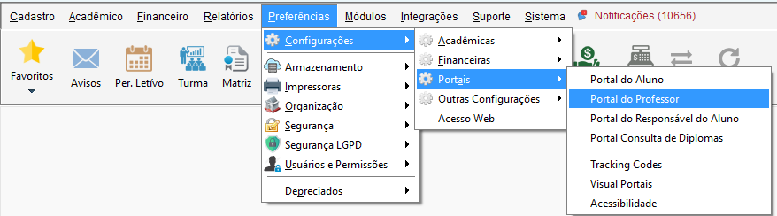 Para habilitar o acesso do grupo de aula no portal do professor, acesse o menu Preferências, navegue até Configurações, clique em Portais e em Portal do Professor.