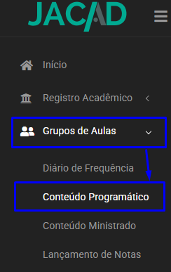 No portal do professor clique no menu Grupo de Aulas e em Conteúdo Programático.