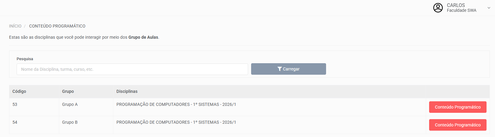 Dessa forma, serão apresentados os grupos de aulas vinculados ao professor, para acessá-los clique no botão Conteúdo Programático.