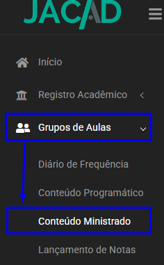 No portal do professor, clique no menu Grupo de Aulas e clique em Conteúdo Ministrado.