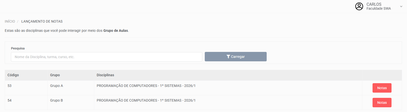 Dessa forma, serão exibidos os grupos de aulas vinculados ao professor. Para acessá-los, clique no botão Notas.