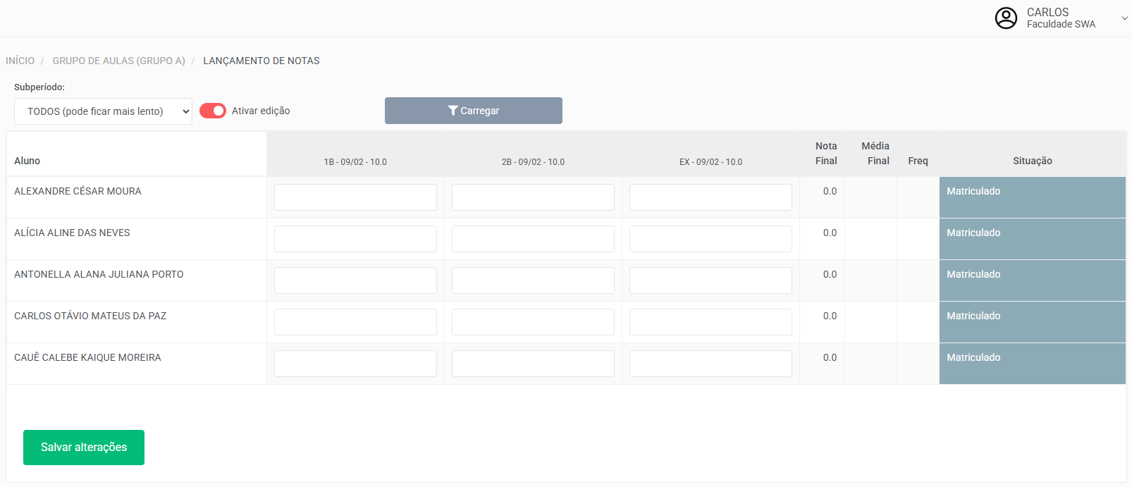 Assim, será exibida a tela para lançamento das notas dos alunos.