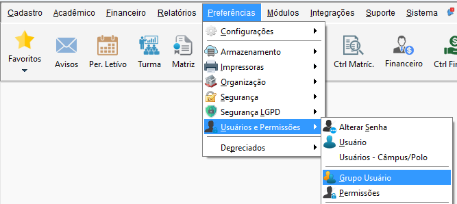 Acesse o menu Preferências, navegue até Usuários e Permissões e clique em Grupo de Usuário.