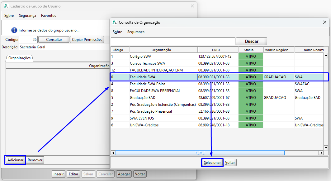 Será possível adicionar apenas uma organização por vez. Caso seja necessário vincular outras organizações ao grupo, repita o procedimento descrito acima.