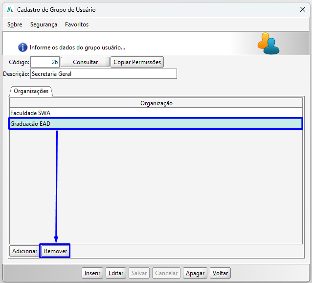 Para retirar o acesso a uma organização de um grupo de usuário, realize o seguinte procedimento: