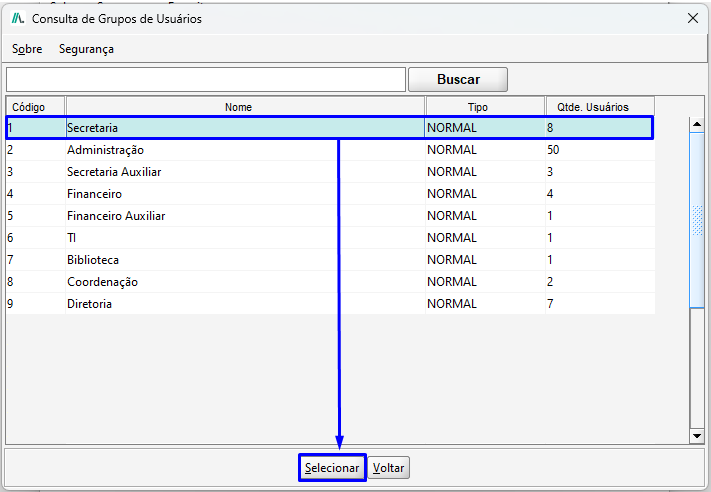 Na sequência, na tela Consulta de Grupos de Usuários, selecione o grupo do qual as permissões serão copiadas e clique em Selecionar.