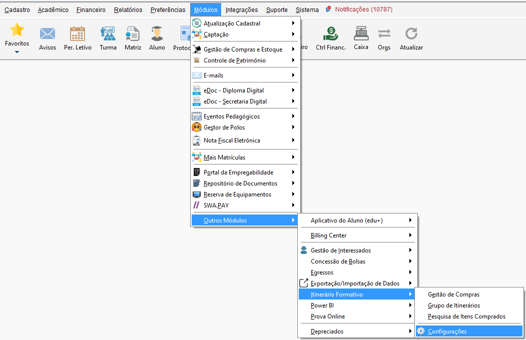 Acesse o menu Módulos, navegue até o submenu Outros Módulos, clique em Itinerário Formativo e em Configurações.