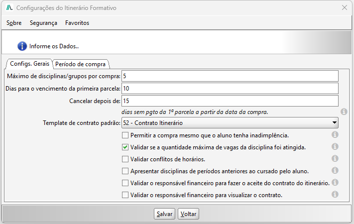 Na tela de Configurações do Itinerário Formativo, acesse a aba Configs. Gerais. Nela, serão exibidas as opções disponíveis para preenchimento:- Máximo de disciplinas/grupos por compra: Configuração para limitar uma quantia máxima de disciplinas/grupos por compra.