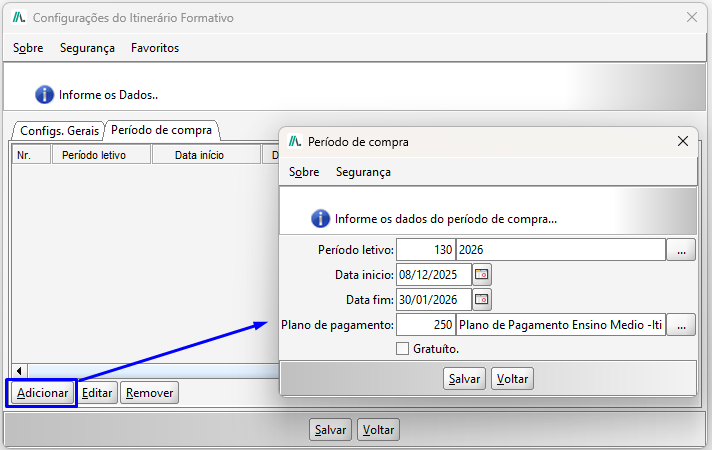 Ao clicar no botão Adicionar, será aberta a tela de configuração do Período de Compra, com os seguintes dados para preenchimento:Período letivo: Período letivo que será liberado a compra de disciplinas do itinerário.