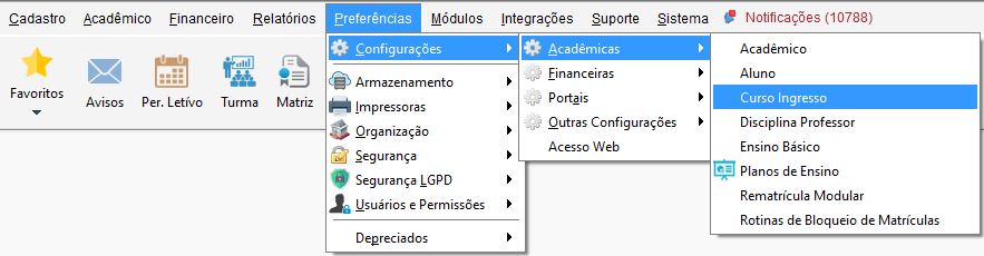 Acesse o menu Preferências, vá até o submenu Configurações, clique em Acadêmicas e em Curso Ingresso.
