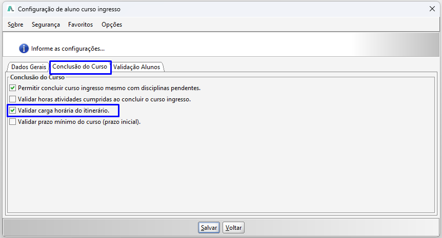 Na tela de Configurações de Aluno Curso Ingresso, clique na aba Conclusão de Curso e marque a opção Validar Carga Horária do Itinerário.