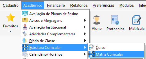 Acesse o menu Acadêmico, navegue até o submenu Estrutura Curricular e clique em Matriz Curricular.