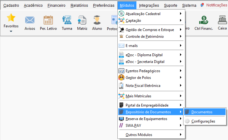 Acesse o menu Módulos, navegue até o submenu Repositório de Documentos e clique em Documentos.