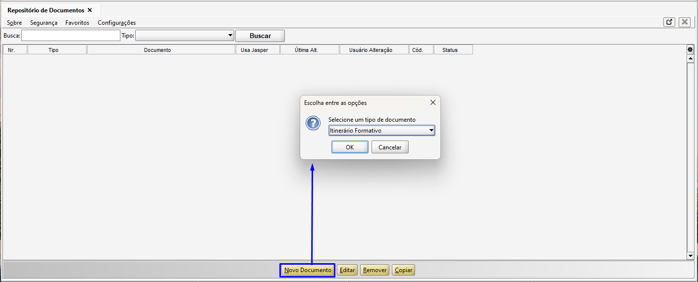 Na tela de Repositório de Documentos, clique no botão Novo Documento e selecione o tipo de documento Itinerário Formativo.