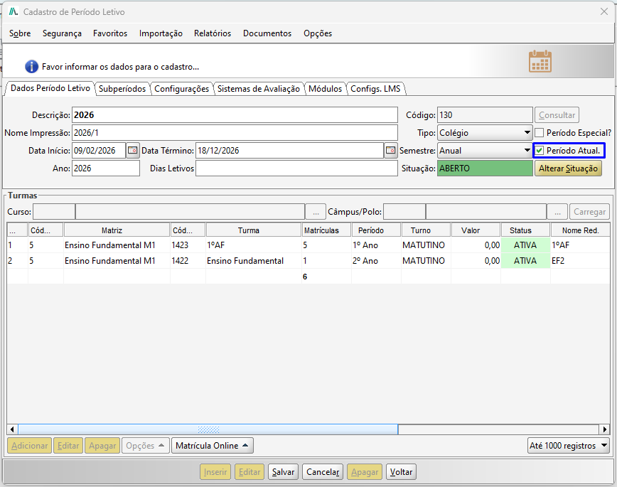 Na tela de Cadastro de Período letivo, marque a opção Período Atual.