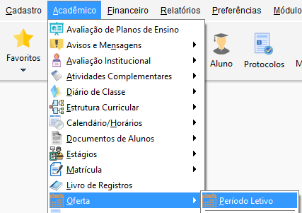 Acesse o menu Acadêmico, navegue até o submenu Oferta e clique em Período Letivo.