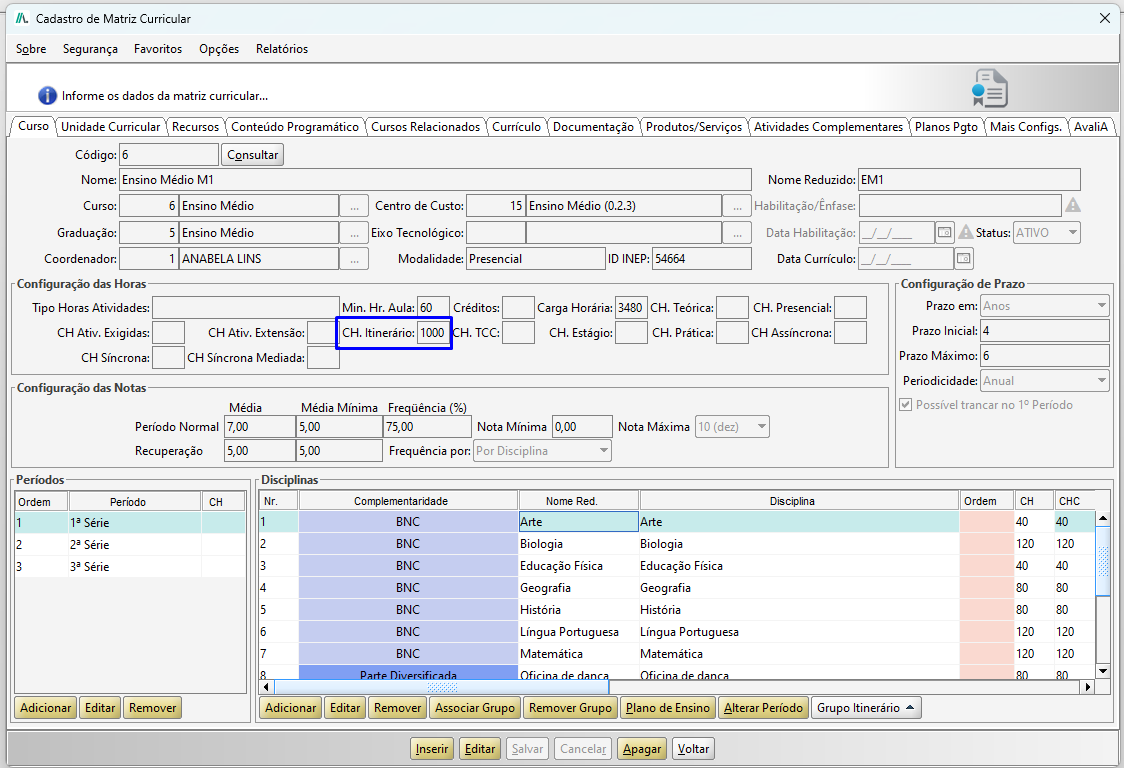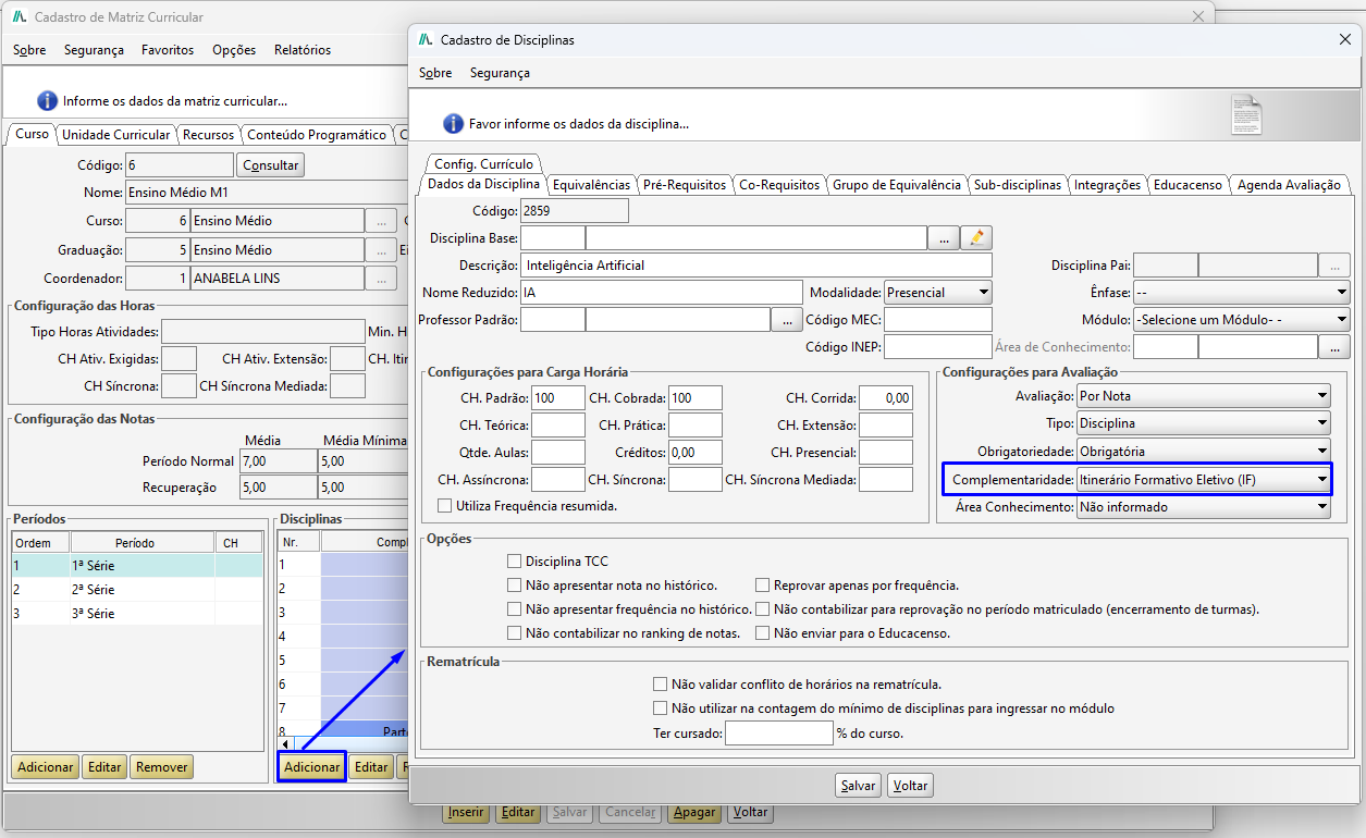 Na tela de Cadastro de Matriz Curricular, realize a seleção da matriz e clique em Adicionar. Na tela de Cadastro de Disciplinas deverá ser informada a complementariedade Itinerário Formativo Eletivo, que são as disciplinas que o aluno irá escolher.