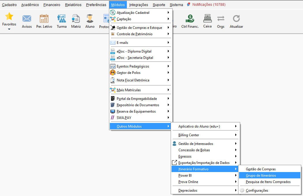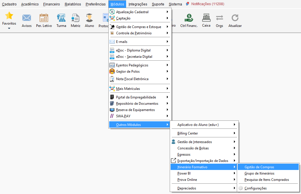 Acesse o menu Módulos, vá até Outros Módulos, clique em Itinerário Formativo e em Gestão de Compras.