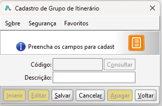 Na tela de Cadastro de Grupo de Itinerário, preencha a descrição (nome) do grupo.