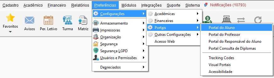 Acesse o menu Preferências, navegue até o submenu Configurações, clique em Portais e em Portal do Aluno.