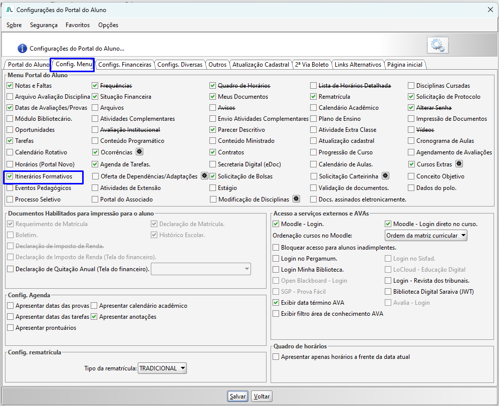 Na tela de Configurações do Portal do Aluno, clique na aba Config. Menu e marque a opção Itinerários Formativos.