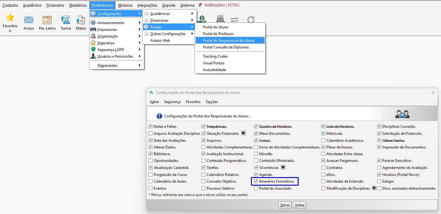 Na tela de Configurações do Portal dos Responsáveis do Aluno marque a opção Itinerários Formativos.