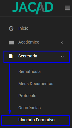 Ao acessar o Portal do Aluno, clique no menu Secretaria e em Itinerário Formativo.