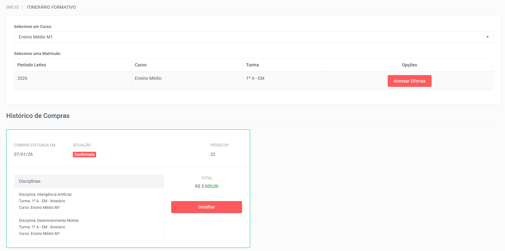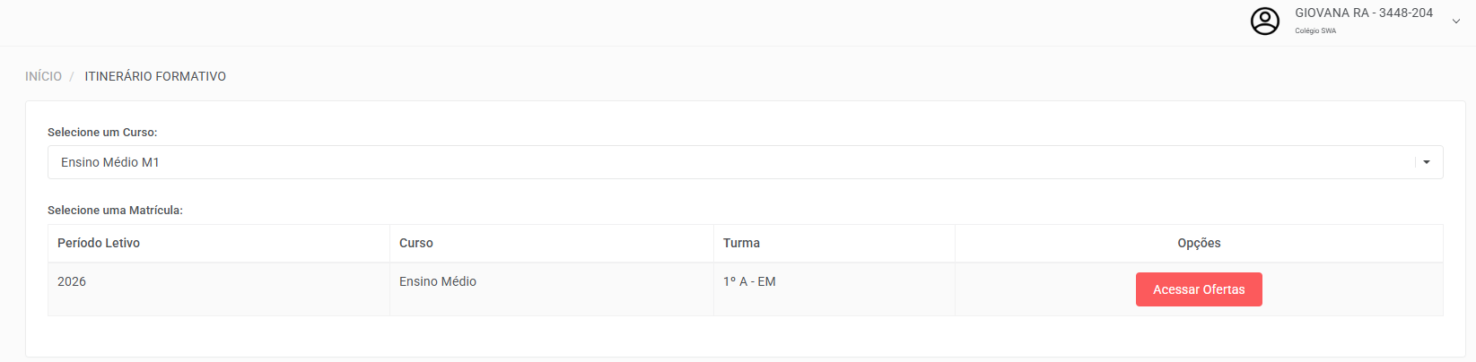 Na tela de Itinerário Formativo, selecione a matrícula correspondente e clique no botão Acessar Ofertas.