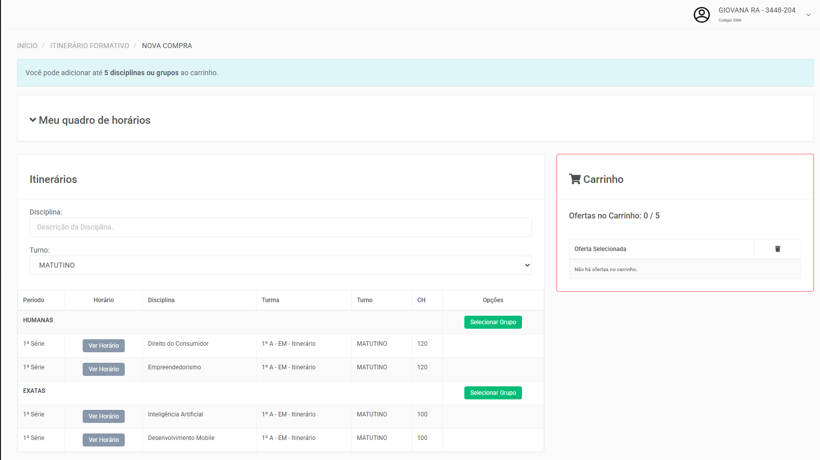 Caso a instituição opte por realizar grupos de itinerário para que o aluno realize a compra deverá ser realizado os passos abaixo: