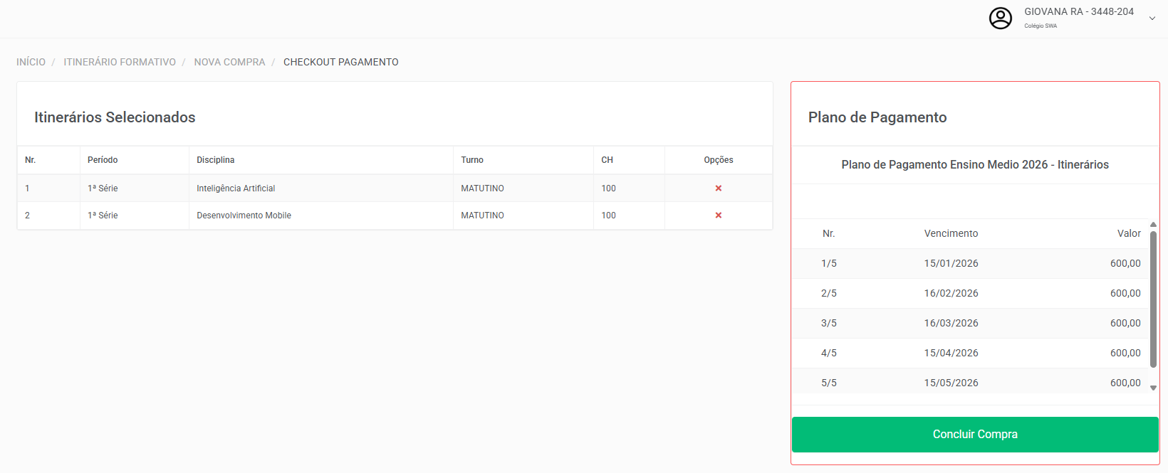 Plano de pagamento: Seleciona o plano de pagamento que foi configurado para as compras do itinerário formativo.