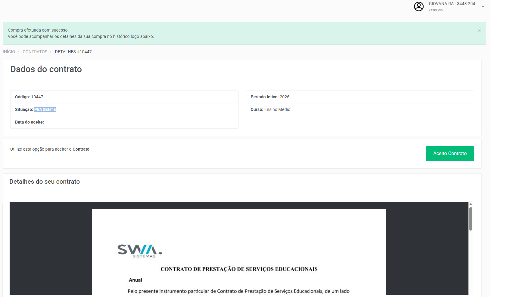 Na sequência o sistema cria um Contrato e redireciona a página de Detalhes do Contrato para realizar o Aceite de Contrato.