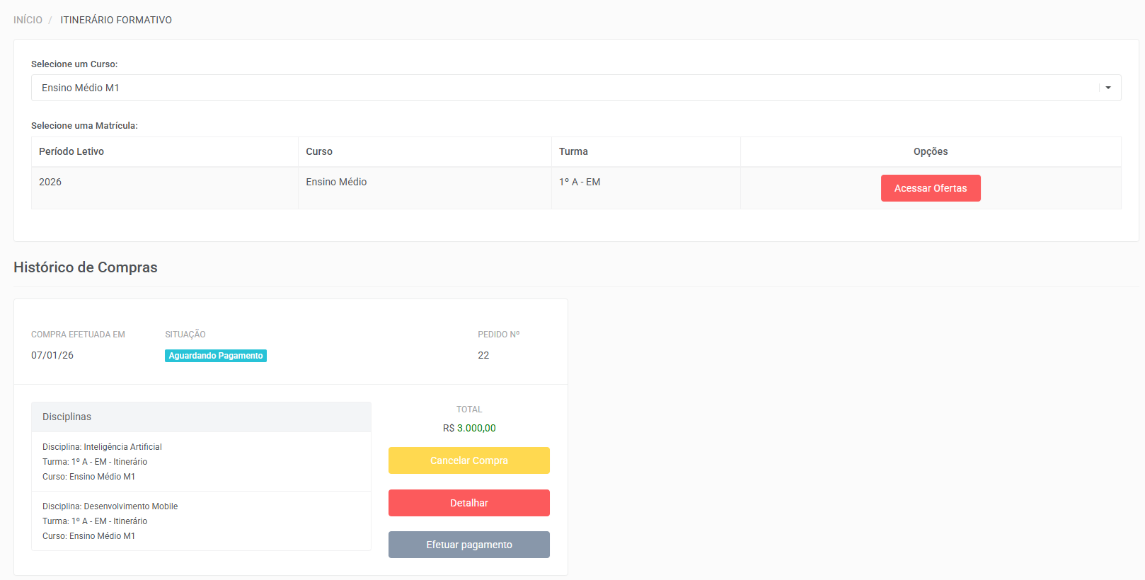 O aluno deve possuir matrícula ativa no período letivo liberado para a compra das disciplinas do itinerário;