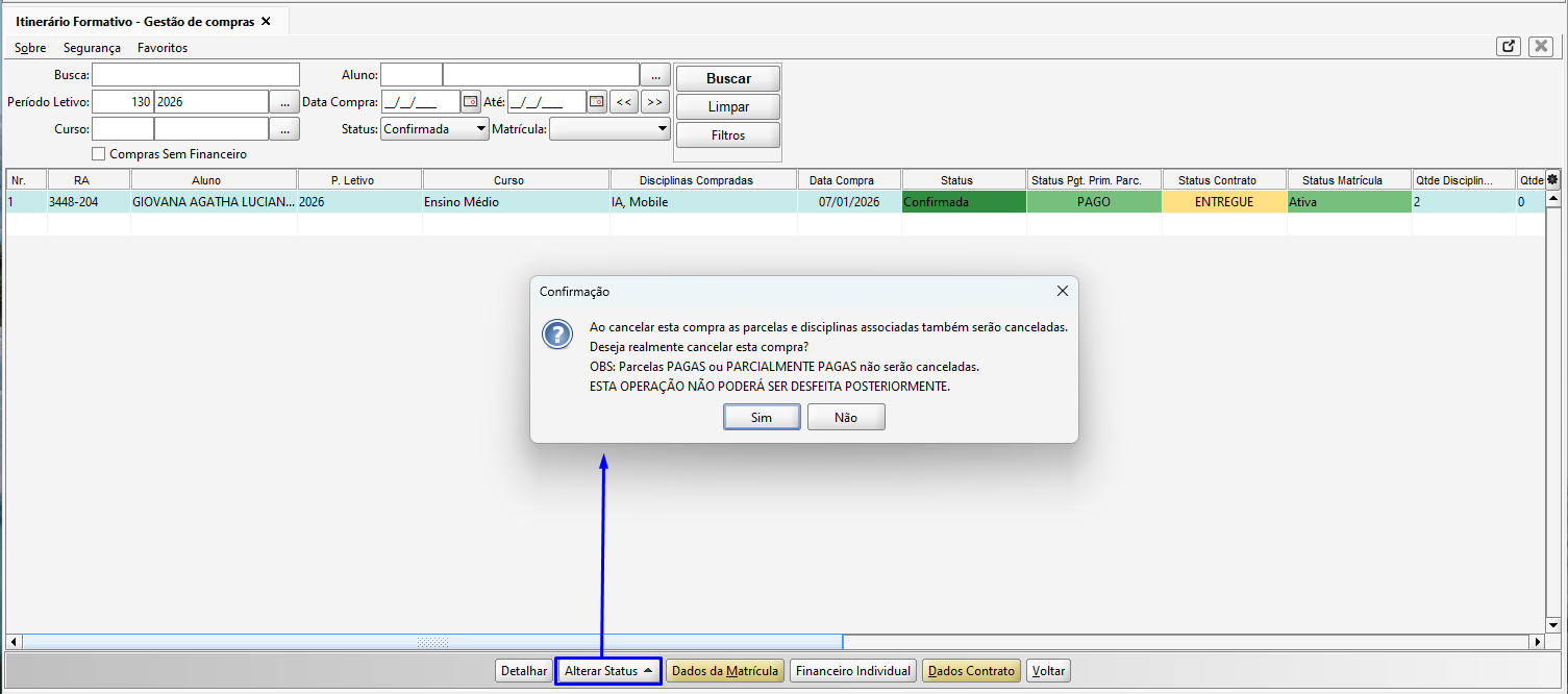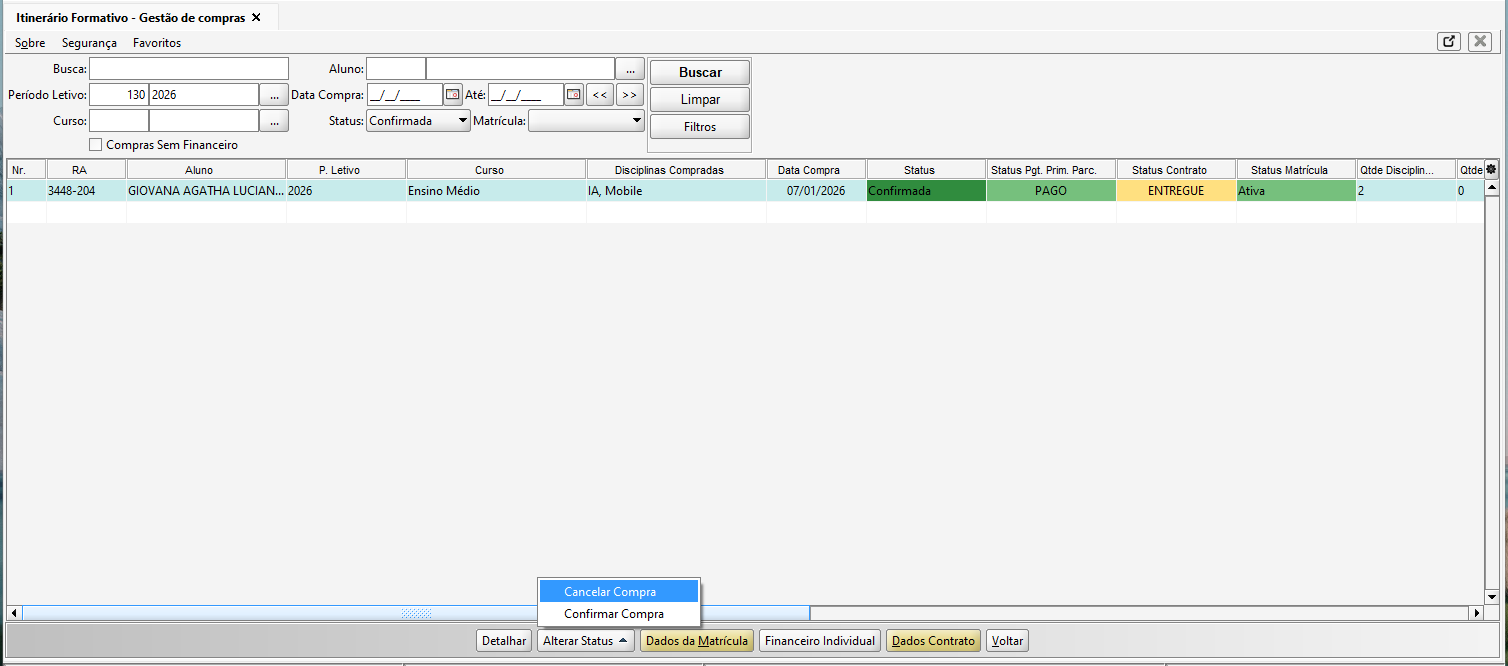 Na tela de Itinerário Formativo - Gestão de Compras, selecionada uma compra confirmada, clique no botão Alterar Status e em Cancelar Compra.