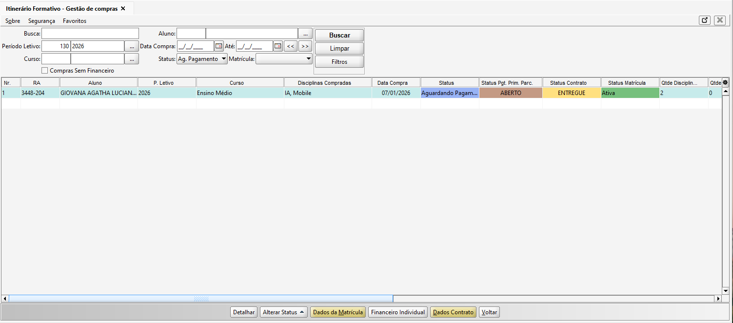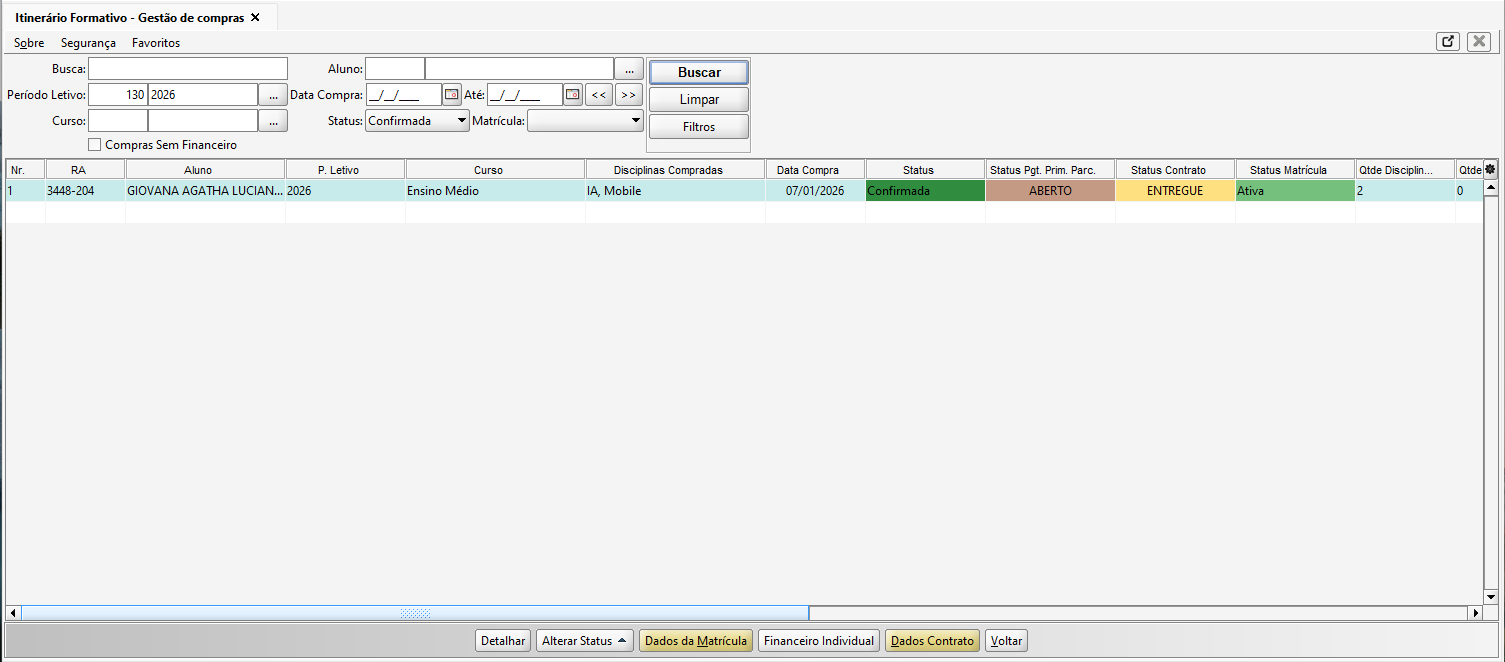 A tela de Itinerário Formativo - Gestão de Compras, tem como finalidade consultar e gerenciar as compras de itinerários formativos realizadas pelos alunos, permitindo acompanhar informações acadêmicas, financeiras e contratuais vinculadas às disciplinas adquiridas. Através dela, o usuário pode aplicar filtros, visualizar o status das compras e acessar ações relacionadas à matrícula, contrato e financeiro.