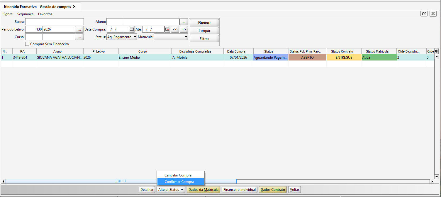 Na tela de Itinerário Formativo - Gestão de Compras, selecionada uma compra Aguardando Pagamento, e clicar no botão Alterar Status e em Confirmar Compra.