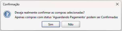 Caso o usuário possua a permissão, será possivel cancelar uma compra confirmada, em que, a mensagem será alterada, conforme demonstrado na imagem abaixo. É importante destacar que Parcelas PAGAS ou PARCIALMENTE PAGAS não serão canceladas, e essa operação não poderá ser desfeita posteriormente.