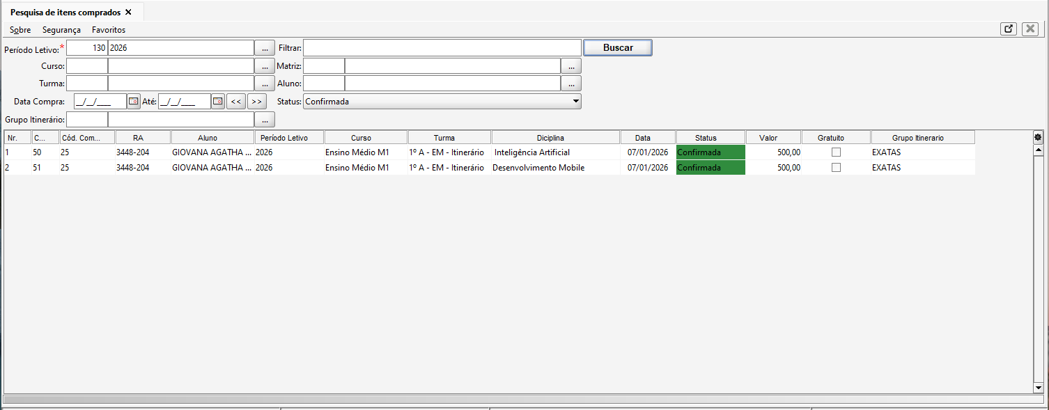 Esta tela tem como finalidade permitir a consulta e o acompanhamento dos itens adquiridos pelos alunos. Nela, é possível realizar filtros por Período Letivo, Curso, Turma, Aluno, Data da Compra, Status e Grupo Itinerário, facilitando a localização de compras específicas.