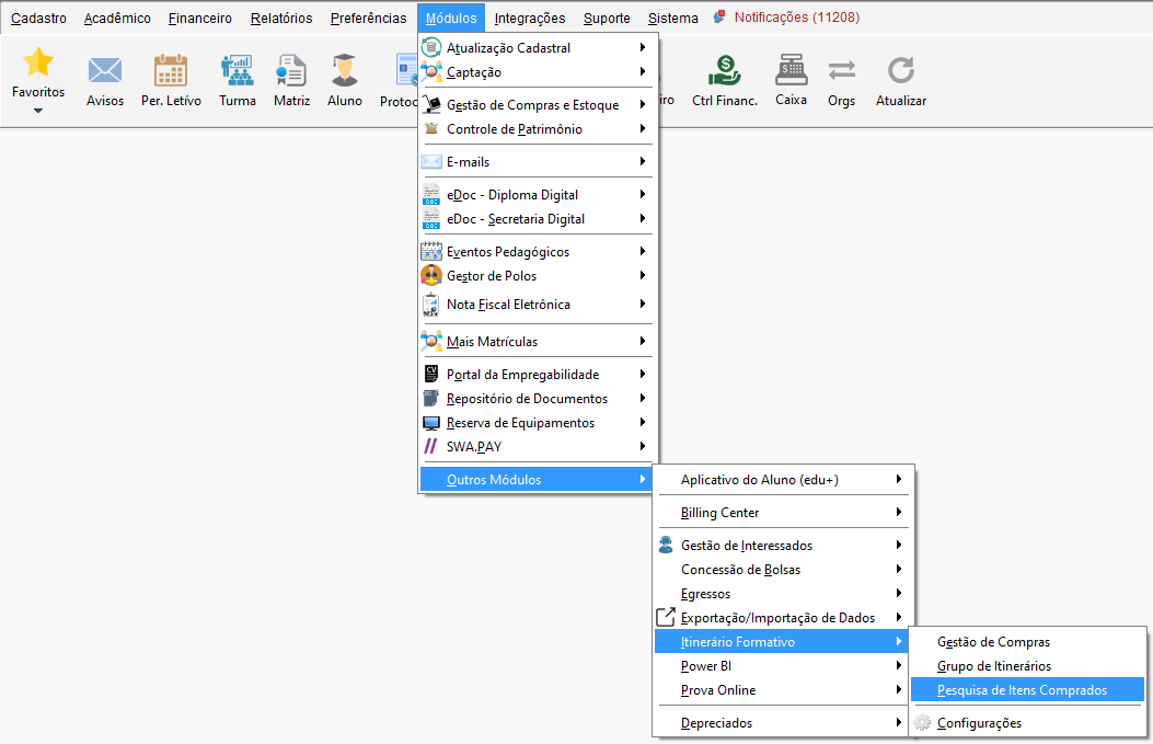 Acesse o menu Módulos, vá até Outros Módulos, clique em Itinerário Formativo e em Pesquisa de Itens Comprados.