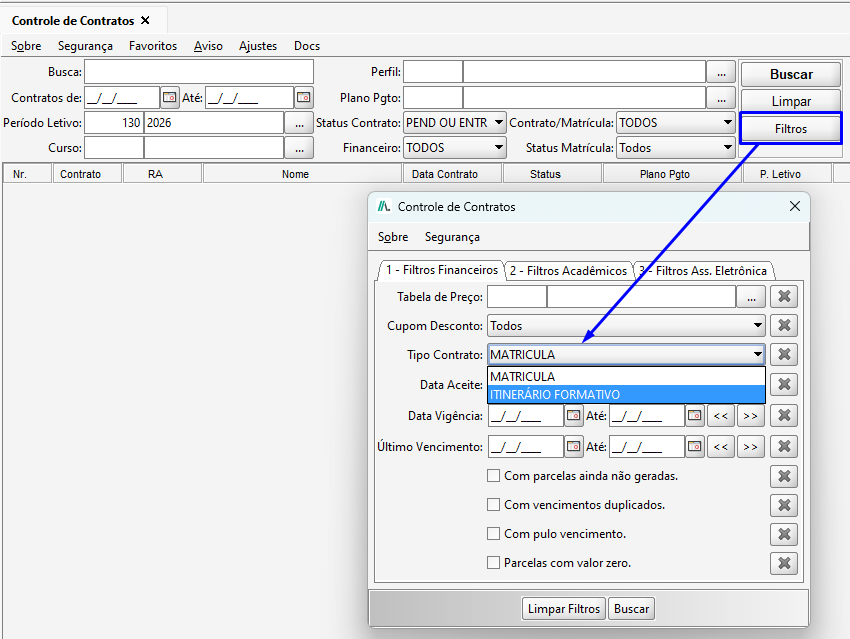 Por meio do botão Filtros, é possível realizar a busca pelo Tipo de Contrato, que, neste contexto, corresponde ao Itinerário Formativo.