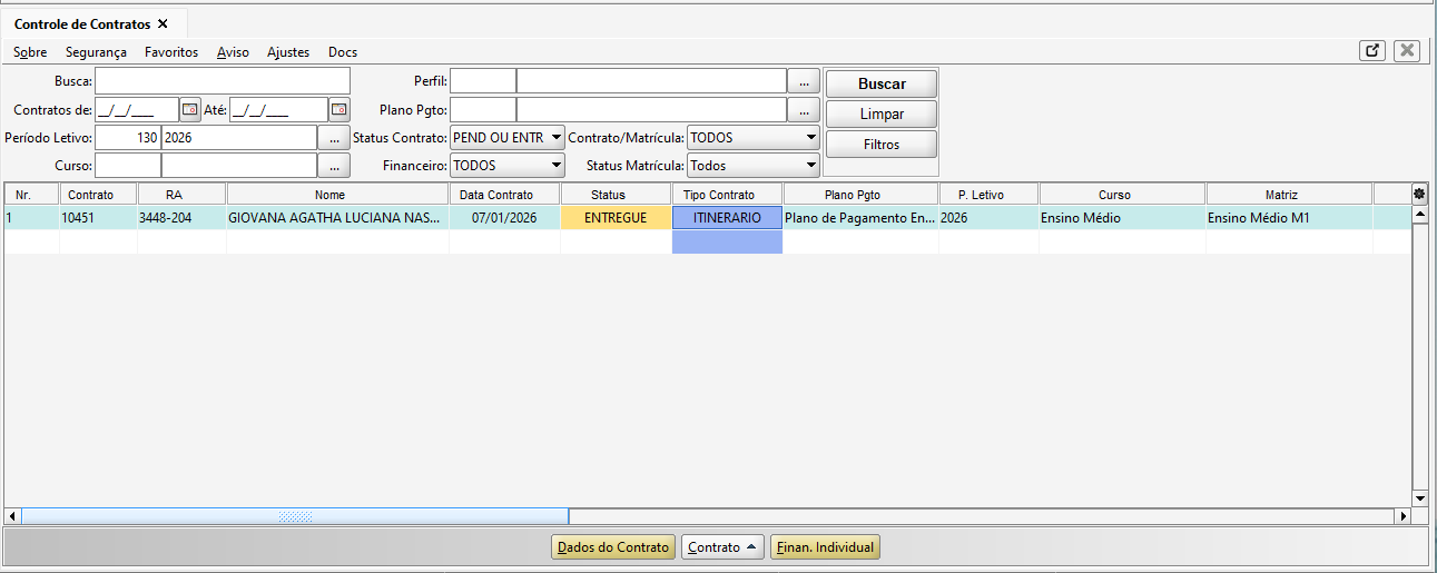 Assim, na tela serão listados todos os contratos referente ao itinerário formativo.